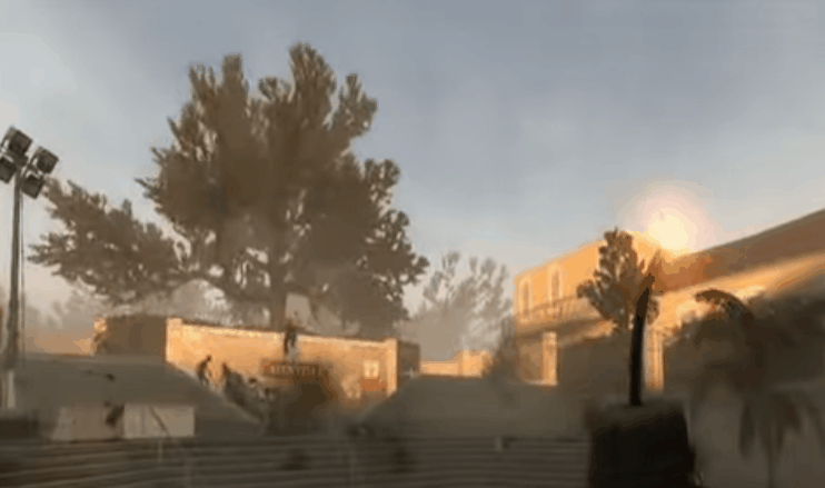 A September 2023 gameplay capture from Hawkins' perspective. An enemy stands on a bridge in front of him.